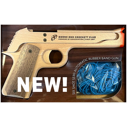 A great gift for the young—and young at heart! Solid beech with walnut grips, this handsome Elastic Precision Model 1911 rubber band gun can fire six rounds under two seconds! Reloads quickly and easily. Reminiscing about those old clothespin shooters of your youth? You deserve this upgrade!