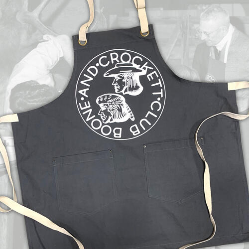 Full length canvas two-pocket apron with the B&C logo silkscreened on the front. The apron is just over 30 inches long and comes in magnet gray with stone beige ties.